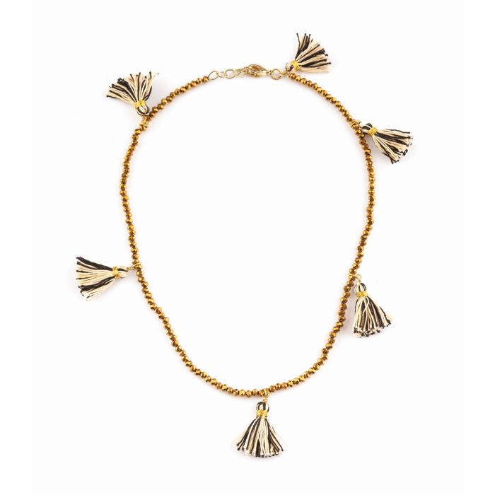 Lass Dich von diesem besonderen Armband begeistern, das Stil und Lebensfreude vereint. Die fein aufgereihten Perlen aus Messing in Schwarz, Gold und Beige wirken modern und sorgen direkt für einen modischen Akzent an Deinem Handgelenk. Die Baumwoll-Fransen setzen charmante Highlights und geben Deinem Look eine verspielte Note.