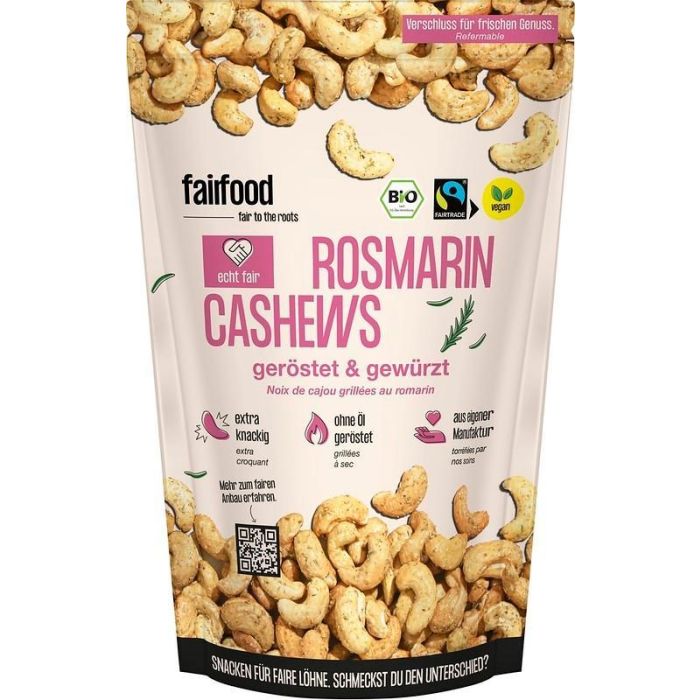 Entdecke den köstlichen Genuss der fairfood Bio-Cashews mit Rosmarin und Thymian! Diese knackigen Cashewkerne vereinen die Aromen des Mittelmeers in einem unwiderstehlichen Snack. Die harmonische Gewürzmischung verleiht den Cashews eine besondere Note und hebt das volle Aroma der Nüsse hervor. Ohne Öl geröstet, sind sie die perfekte Wahl für ein leicht knackiges Snack-Erlebnis, das Dich begeistern wird.