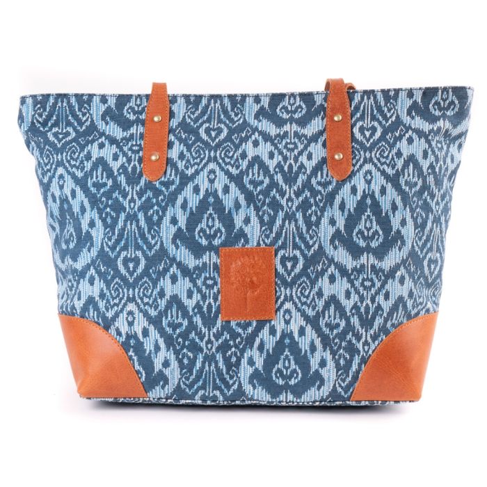 Diese elegante Damen-Handtasche kombiniert stilvolles Design mit Nachhaltigkeit. Sie besteht zu 100 % aus Baumwolle aus kontrolliert biologischem Anbau und ökologisch gegerbtem Büffelleder in einem schönen Blau-Braun-Ton. Jeder Kauf dieser Tasche unterstützt faire Arbeitsbedingungen in Indien, da wir nach den Grundsätzen der World Fair Trade Organization handeln.
