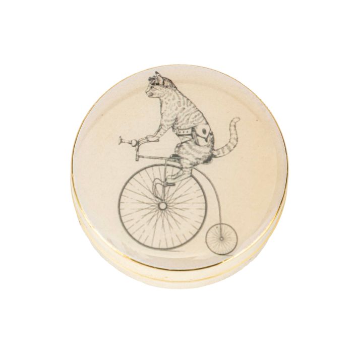 Unser handgefertigtes Pillendöschen mit einem charmanten Katzenmotiv auf dem Deckel ist ein stilvolles und praktisches Accessoire. Hergestellt aus hochwertigem Messing und verziert mit einem detailreichen Siebdruck, besticht es durch seine Kombination aus Funktionalität und Ästhetik. Mit einem Durchmesser von 4,5 cm ist es kompakt und leicht zu transportieren, perfekt für die sichere Aufbewahrung von Medikamenten oder kleinen Schätzen. Jede Dose wird unter fairen Bedingungen von Kunsthandwerker*innen unseres Handelspartners Tara in Indien gefertigt, was dieses Stück nicht nur zu einem nützlichen, sondern auch zu einem ethisch verantwortungsvollen Kauf macht.