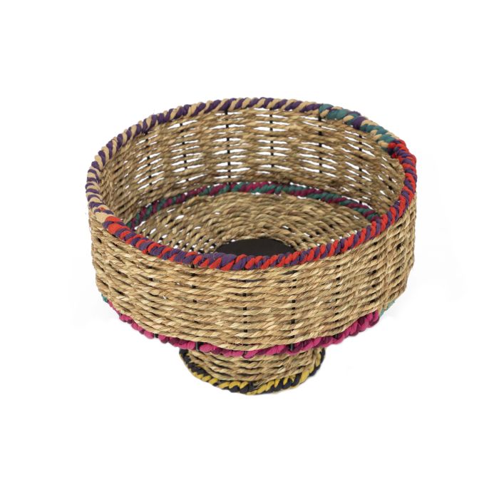 Verleihe Deinem Esstisch oder Sideboard einen besonderen Akzent mit dieser handgefertigten Deko-Etagere. Der Eisenrahmen ist kunstvoll mit naturfarbenem Seegras und bunten, recycelten Sarisumwickelt, was eine einzigartige Geschichte und charmante Optik verleiht. Mit einem Durchmesser von 27 cm und einer Höhe von 18,5 cm, bietet sie ausreichend Platz und steht stabil auf einem Sockel. Handgefertigt in Indien von Kunsthandwerker*innen unseres Handelspartners Noah's Ark unter fairen Bedingungen, vereint sie Nachhaltigkeit und traditionelles Handwerk. Die recycelten Saris erhalten ein zweites Leben und machen die Etagere zu einem unverwechselbaren Kunstwerk.