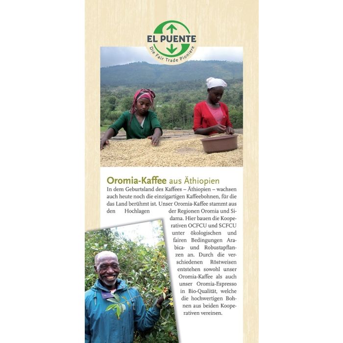 Schon gewusst? Äthiopien gilt als Geburtsland des Kaffees! Dieser Flyer stellt unseren beliebten Oromia-Kaffee und Oromia-Espresso in Bio-Qualität vor. Im Handumdrehen vom Flyer zum Aufsteller gemacht: Einfach in der Mitte an der vorgestanzten Linie knicken.