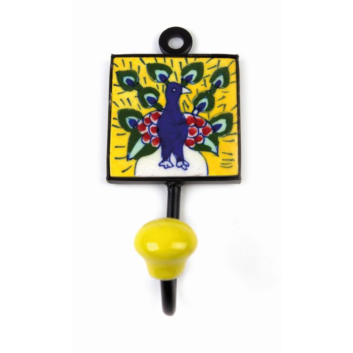 Unsere bunte Vielfalt für Deine Garderobe! Dieser Garderobenhaken ist mehr als nur praktische Helfer - er ist ein kleines Kunstwerk, handgefertigt von talentierten Kunsthandwerker*innen aus Indien. Die 5 x 5 cm großen Keramikkachel, die die Haken ziert, ist einzigartig und erzählt ihre eigene Geschichte durch leuchtende Farben und ein verspieltes Pfauen-Motiv. Das Eisen verleiht den Haken Stabilität und Langlebigkeit. Ob im Schlaf- oder Kinderzimmer, Flur oder Bad - dieser Haken bringt Lebensfreude in jeden Raum.