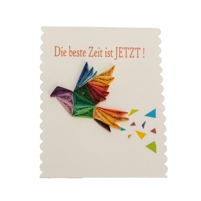 Genau die richtige Wahl, um einem geliebten Menschen oder Freund*in Grüße von Herzen zu übermitteln. Aufwändig per Hand unter fairen Bedingungen gefertigt und verziert von vietnamesischen Kunsthandwerker*innen unseres Handelspartners Mai Vietnamese Handicrafts aus buntem, gerollten Papier. Dieser wunderschöne Vogel in Form einer Karte und dem Spruch: "Die beste Zeit ist jetzt!" ist eine liebevolle Geste und lässt sich auch toll als kleines Kunstwerk an die Wand hängen. Zum Verschicken wird ein Kompaktbriefporto benötigt.