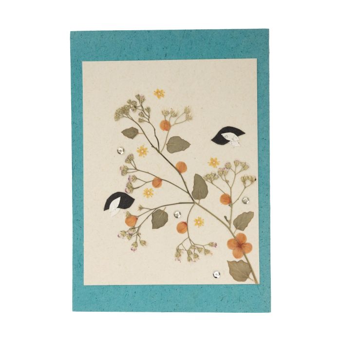 Diese liebevoll handgefertigte Karte zeigt ein verspieltes Vögelchen auf blauem handgeschöpftem Papier, verziert mit bunten Blütenapplikationen. Die Doppelkarte mit Umschlag (12 x 17 cm) eignet sich ideal, um besondere Grüße stilvoll zu überbringen. Hergestellt von Kunsthandwerker*innen unseres Partners Salay auf den Philippinen.