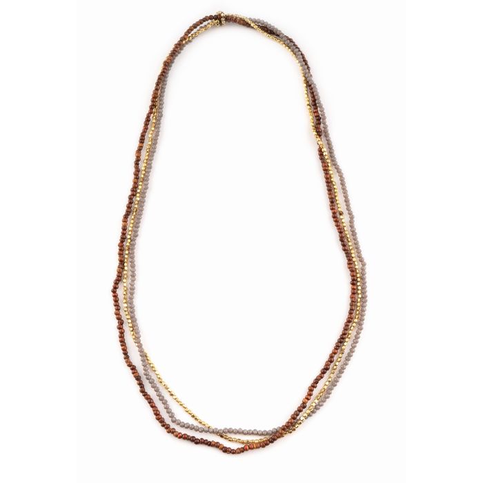 Die Layering Kette „3in1“ inspiriert auf besondere Weise mit ihrem außergewöhnlichen Mix aus Messing, Holz und Glasperlen. In warmen Gold-, Braun- und Blautönen gehalten, bringt sie einen eleganten Glanz in Deinen Alltag. Die etwa 83 cm lange Kette wurde von talentierten Kunsthandwerker*innen in Indien mit viel Herzblut gefertigt. Jede Perle ist einzeln von Hand aufgefädelt und verleiht der Kette ihren unverwechselbaren Charakter. Das Design vereint Natürlichkeit und modernen Stil, sodass Du sie einzeln getragen oder im Lagenlook kombinieren kannst.