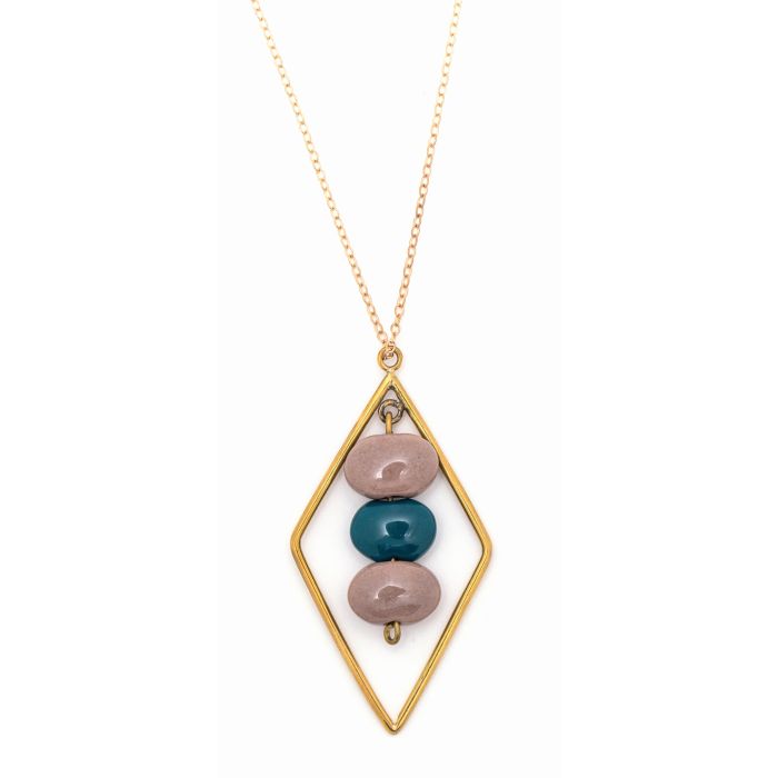 Diese besondere Keramik Kette vereint Keramik und recyceltes Messing in warmen Gold-, Grau- und Türkistönen und ist ein echtes Design-Highlight. Mit einer Kettenlänge von etwa 80 cm und einem 5,5 cm langen Anhänger trägt sie sich angenehm und wirkt stilvoll zu jedem Outfit. Das Schmuckstück wird von Kunsthandwerker*innen in Kenia unter fairen Bedingungen gefertigt. Es ist Ausdruck für Wertschätzung und bringt Dir ein einzigartiges Tragegefühl. Die Verbindung aus liebevoller Handarbeit und außergewöhnlicher Formgebung macht diese Kette zu Deinem neuen Lieblingsstück.