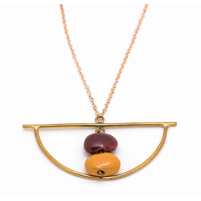 Mit dieser besonderen Keramik Kette erhältst Du ein Schmuckstück, das nicht nur durch sein modernes Design aus recyceltem Messing, goldene Farbtöne und leuchtende Keramikanhänger in Rot und Gelb begeistert, sondern auch durch seine sinnvolle Herkunft. Die Kette wurde liebevoll in Kenia handgefertigt, im Rahmen eines Projekts für Geflüchtete, das Hoffnung, Würde und neue Perspektiven schafft. Die Kombination aus sanften Rundungen, warmen Farben und der hochwertigen Verarbeitung macht sie zum perfekten Begleiter für Deinen Alltag.