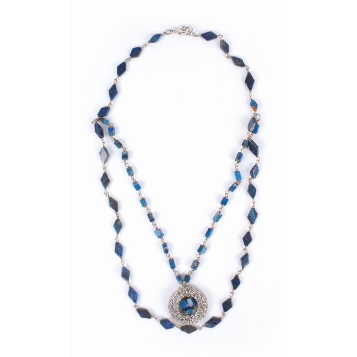 Die Lapislazuli Halskette aus tiefblauem Lapislazuli begeistert durch ihren kunstvollen Anhänger, der von Hand aus Eisendraht und Messing gefertigt wurde. Mit einer Länge von etwa 58 cm und einem Anhänger von ca. 3 cm Durchmesser bietet sie ein angenehmes Tragegefühl und liegt sanft auf Deiner Haut. Jedes Stück ist ein handgefertigtes Unikat, das mit viel Sorgfalt und Können traditioneller Kunsthandwerker*innen in Indien entstanden ist. Da ausschließlich fair gehandelte Materialien verwendet werden, kannst Du dieses Schmuckstück mit Stolz und gutem Gewissen tragen.