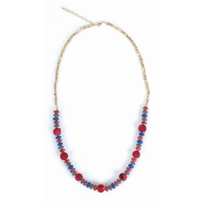 Diese bunte Perlenkette verbindet liebevolle Handarbeit mit nachhaltiger Eleganz. Jedes Schmuckstück wird in Indien von erfahrenen Kunsthandwerker*innen gefertigt und besteht aus goldfarbenem Messing sowie Perlen, die kunstvoll mit buntem, aus alten Stoffen recyceltem Baumwollgarn umwickelt sind.