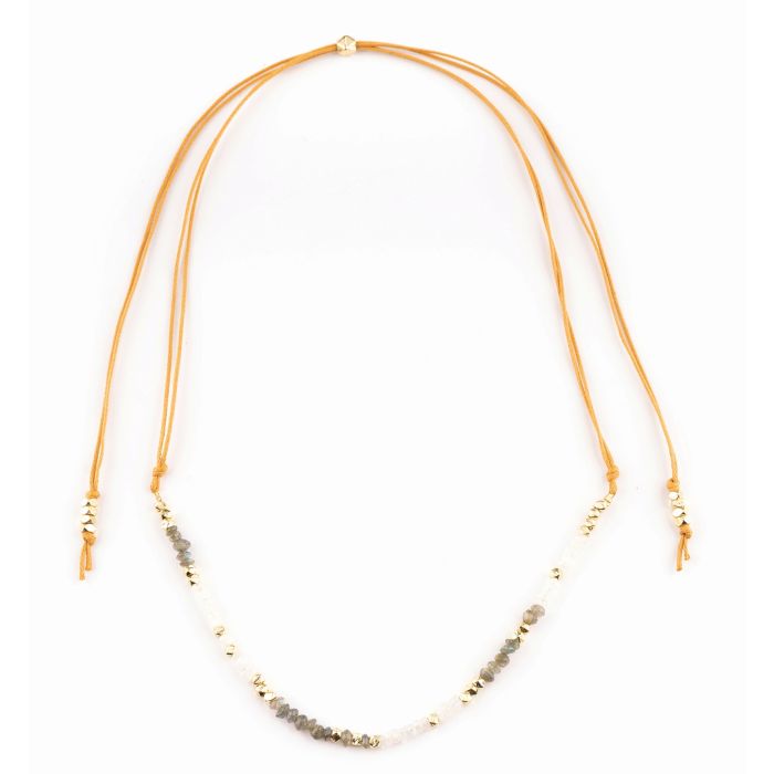 Diese filigrane Kette mit Glasperlen verbindet goldfarbenes Messing, zarte Glasperlen und ein weiches Baumwollband zu einem stilvollen Accessoire. Die Kombination aus Gold, Grau und Braun sorgt für eine warme und harmonische Optik, die jedes Outfit veredelt. In liebevoller Handarbeit entstehen diese Schmuckstücke durch erfahrene Kunsthandwerker*innen aus Indien. Das längenverstellbare Band gibt Dir Flexibilität und ein angenehmes Tragegefühl den ganzen Tag.