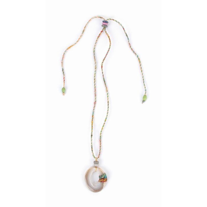 Mit dieser handgemachten Kette bringst Du Farbe und Vielfalt in Deinen Alltag. Das handgefertigte Schmuckstück aus Indien besteht aus recycelter Baumwolle, Quarz und Ton und vereint handwerkliche Kunst mit verantwortungsvollem Materialeinsatz. Der Anhänger, ein spannender Kreis aus Quarz und Ton, zieht durch seinen sanften Glanz und die harmonische Farbvielfalt alle Blicke auf sich. Die Länge der Kette ist bis zu 76 cm individuell verstellbar, sodass sie sich perfekt an Deine Wünsche anpasst und stets angenehm zu tragen ist.