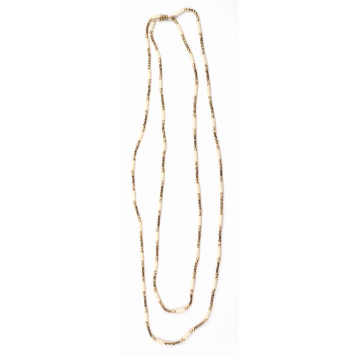 Entdecke eine handgemachte Kette, die mit liebevoller Handarbeit aus Messing und Kunstharz gefertigt wurde. Ihr schimmerndes Gold und das stilvolle Creme verleihen Deinem Look eine sanfte Eleganz, die sowohl im Alltag als auch zu besonderen Anlässen begeistert. Mit einer großzügigen Länge von 180 cm lässt sich das Schmuckstück individuell und spielerisch tragen, ob doppelt gelegt oder lässig als Statement-Accessoire.