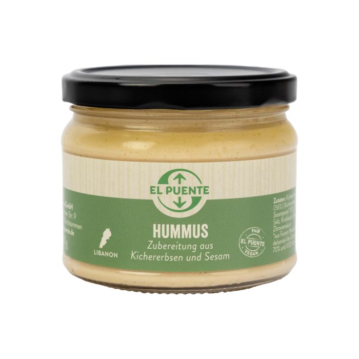 | Zutaten | Kichererbsen°, Tahini° (aus Sesamsaat), Säuerungsmittel Zitronensäure, Salz, Knoblauch; °aus Fairem Handel, Fair-Handelsanteil der Zutaten insgesamt: 70% und 100% faire Produktion. |