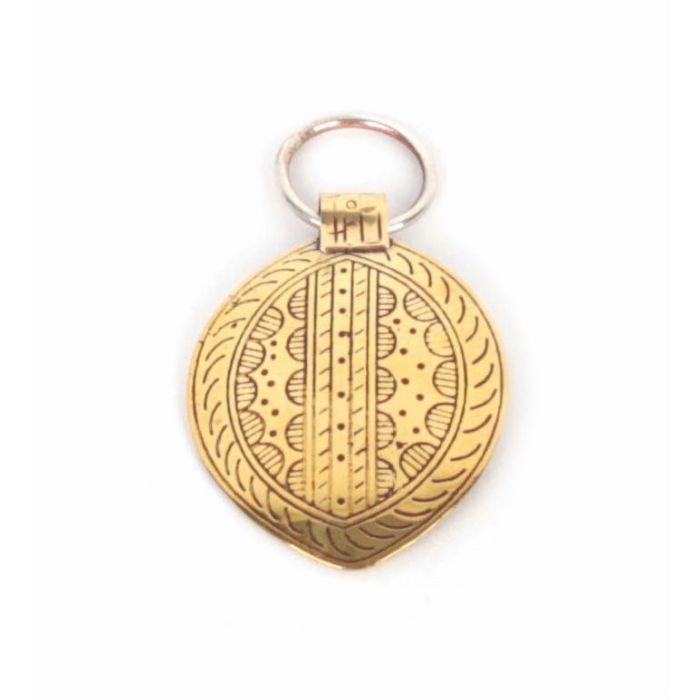 In den eingravierten Mustern des Messings verfängt sich die Sonne und lässt diesen Anhänger erstrahlen. Egal ob mit einem Lederband um den Hals oder mit einem Schlüsselring an deinem Schlüsselbund, dieser Anhänger ist ein wahrer Blickfang. Wem diese Gravur gefällt, findet in unserem Sortiment noch passende Ohrringe.