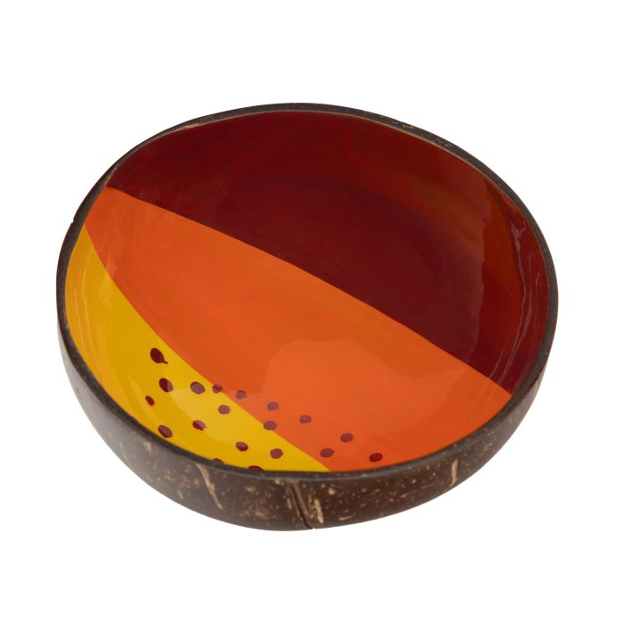 Bring Freude und Lebendigkeit auf Deinen Tisch: Diese kunstvolle Kokosnuss-Schale verführt Dich sofort mit ihren leuchtenden Tönen in Rot, Orange und Gelb. Schon beim ersten Anblick spürst Du die sorgfältige Handarbeit, die jedem Exemplar eine ganz eigene, stilvolle Note verleiht.