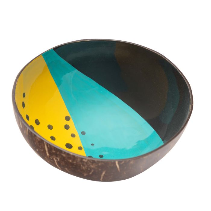Stell Dir vor, Du bringst mit einer außergewöhnlichen Schale Farbe und Individualität in Dein Zuhause. Die lebendige Kombination aus Dunkelblau, Türkis und Gelb, kunstvoll auf der Innenseite lackiert, begeistert nicht nur optisch, sondern schafft auch sofort eine warme, einladende Atmosphäre. Jede Kokosnuss-Schale wird von erfahrenen Handwerker*innen in Vietnam gefertigt und erhält durch die sorgfältige Verarbeitung einen ganz eigenen Charakter.