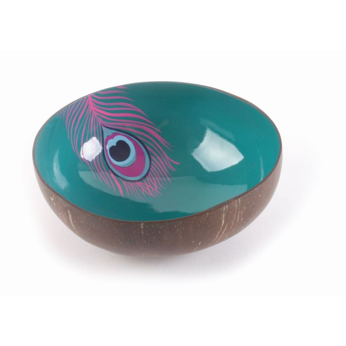Verleihe Deinem Zuhause einen Hauch Lebendigkeit mit der Kokosnuss-Schale „Pfauenfeder“. Das intensive Türkis auf der Innenseite strahlt Frische aus und bringt Farbe in Deinen Alltag. Jede Schale wird aus besonders festen Kokosnüssen aus Südvietnam gefertigt und durchläuft viele raffinierte Arbeitsschritte, bis sie sich seidig anfühlt und ihren sanften Schimmer erhält.