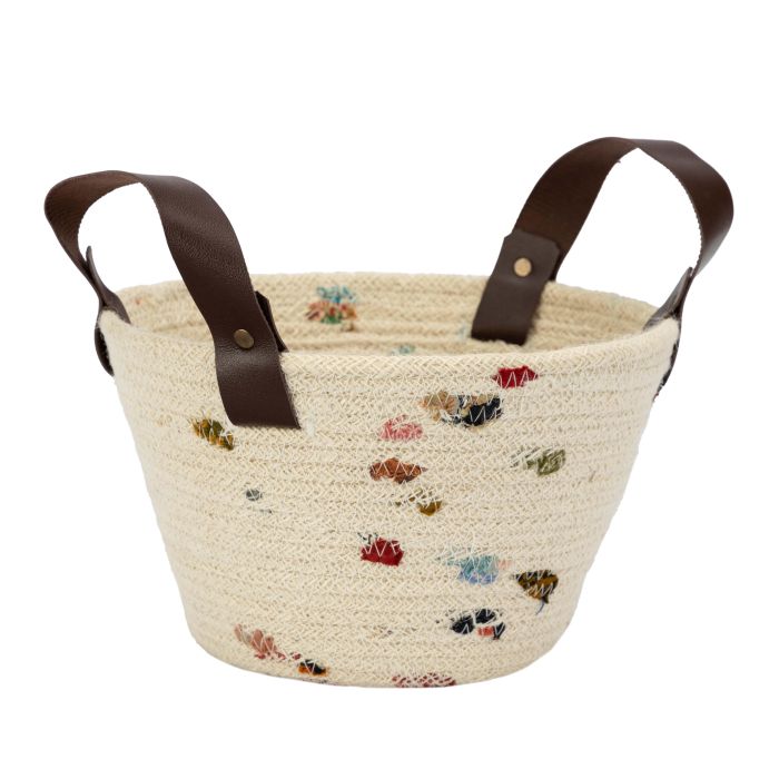 Der handgefertigte Korb mit Henkeln „Sparkle“ schenkt Deinem Zuhause Wärme und Stil. Mit viel Liebe von Kunsthandwerker*innen in Bangladesch gefertigt, begeistert dieses besondere Stück aus Jute mit eingearbeiteten, farbenfrohen Akzenten aus wiederverwertetem Sari-Stoff. Die bunten Details setzen lebendige Highlights im beigen Grundton und machen jeden Korb zu einem echten Einzelstück. Dank der großzügigen Maße von 15 cm Höhe und 24 cm Durchmesser eignet sich der Korb ideal zur stilvollen Aufbewahrung kleiner Schätze, Kosmetik oder als originelle Geschenkverpackung.