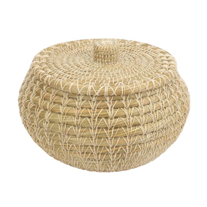 Der runde Korb mit Deckel „Schmetterling“ verbindet authentisches Design mit feinster Handarbeit und verleiht Deinem Zuhause einen natürlichen Akzent. Aus stabilem Kaisa-Gras sorgsam geflochten, wird jedes Stück von geschulten Kunsthandwerker*innen in Bangladesch gefertigt und mit weißen Jute-Fäden liebevoll umwickelt. Durch die besondere Struktur spürst Du sofort die hohe Qualität und das angenehme Gefühl in den Händen. Der intelligente Deckel sorgt dafür, dass Deine Habseligkeiten ordentlich verstaut bleiben, während der Korb stylisch jedes Zimmer bereichert. Für Handtücher im Bad, Kosmetik, Wolle oder andere Schätze eignet sich dieser Aufbewahrungskünstler perfekt.