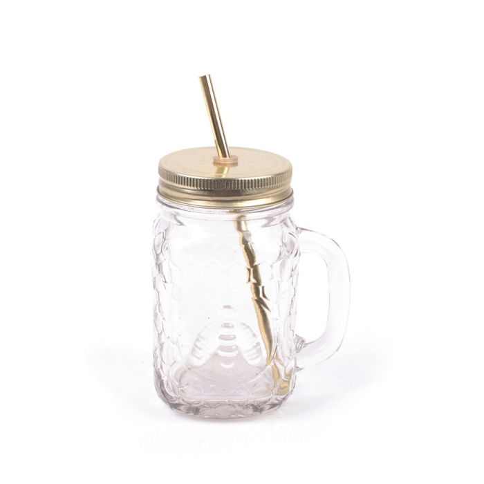 Glas, transparent mit goldenem Deckel, mit Henkel und integriertem Strohhalm aus Messing, H 13,5 cm, Ø 7 cm