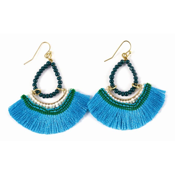 Diese außergewöhnlichen Ohrringe verbinden Design und Kunsthandwerk in einzigartiger Weise. Gefertigt aus feinem Messing, Glasperlen und sorgfältig ausgewählten Textilfäden, vereinen sie harmonisch Türkis-, Grün-, Weiß- und Goldtöne. Mit einer Länge von etwa 6 cm schmiegen sie sich sanft an Dein Ohr und sind leicht zu tragen. Das Spiel von Licht in den Glasperlen sorgt für einen lebendigen, strahlenden Eindruck, während die Textilfäden alle Blicke auf sich ziehen.