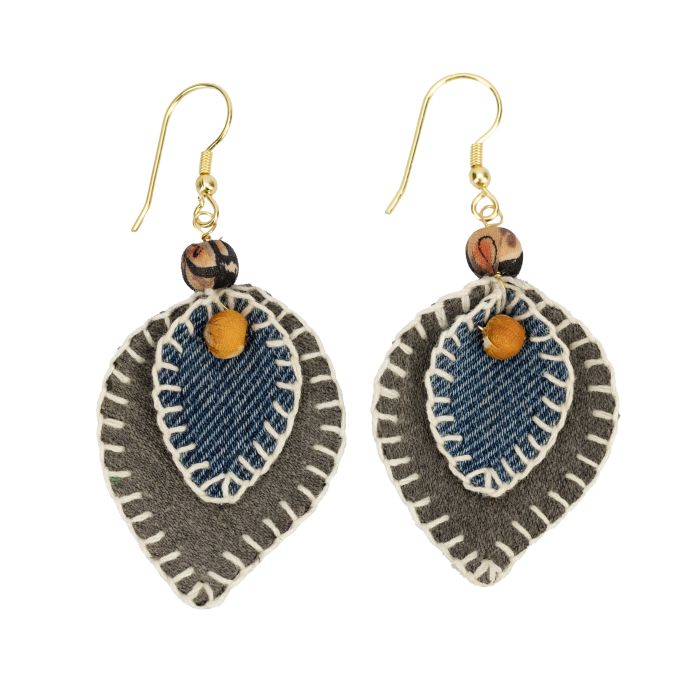 Diese Ohrringe bringen Freude und Stil in Deinen Alltag. Aus Messing und sorgfältig ausgewählten, wiederverwendeten Jeans- sowie Sari-Stoffen gefertigt, strahlen sie in warmen Blau-, Grau- und Gelbtönen. Die filigrane Handarbeit macht jedes Paar zum Einzelstück, das durch weiße Nähte und feine Perlen liebevoll verziert ist. Mit einer Länge von etwa 5,5 cm umrahmen sie charmant Dein Gesicht und ergänzen sowohl schlichte als auch ausgefallene Looks.