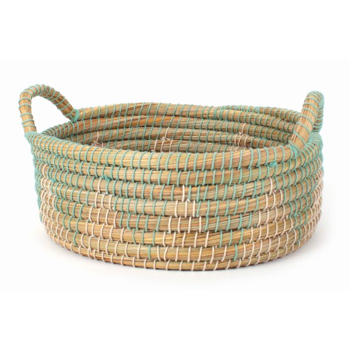 Die Korbflechterei ist ein aufwendiger Prozess, welcher viel Geschick und Erfahrung voraussetzt. Dieser Korb mit praktischen Griffen wurde in liebevoller Handarbeit von den Kunsthandwerker*innen aus Bangladesch geflochten und mit einer türkis weißen Baumwollumwicklung veredelt.
