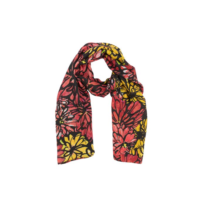 Erlebe mit dem handgefertigten Schal aus Seide das Gefühl von Luxus und Wärme direkt auf Deiner Haut. Das kunstvolle Design besticht durch leuchtende Rot-, Gelb- und Schwarztöne und bringt Farbe in Deinen Alltag oder Deine besonderen Momente. Jeder Schal wurde sorgfältig in Indien von Kunsthandwerker*innen aus 100 % reiner Seide hergestellt, ein Material, das für seine sanfte Haptik und glänzende Optik bekannt ist.