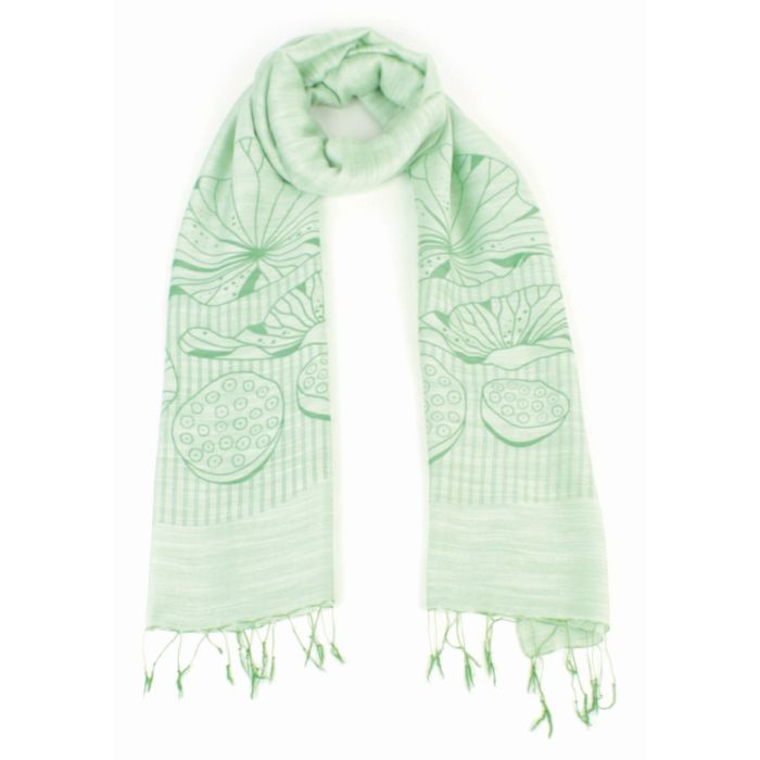 In Vietnam wird jeder Schal in sorgfältiger Handarbeit gefertigt. Jeder einzelne Schritt ist Ausdruck von Respekt, Achtsamkeit und Liebe zum Detail. Ein stilvolles und einzigartiges Accessoire, dessen Muster von einer Seerose inspiriert ist.