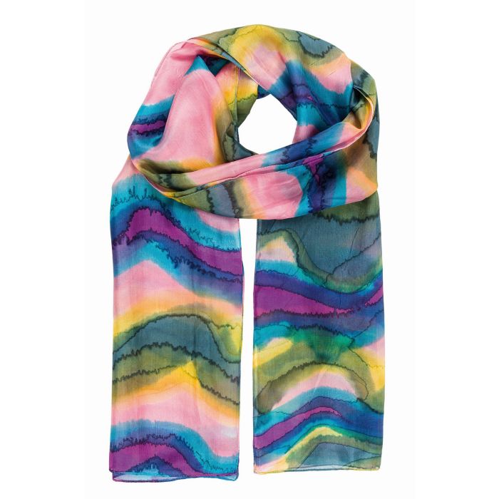 Mit diesem wunderschönen Schal aus 100 % Seide bringst Du Freude und Farbe in Deinen Alltag. Das Design mit den sanft geschwungenen Wellen in lebendigen, handbemalten Batikfarben macht jedes Outfit zu etwas ganz Besonderem und sorgt für einen stilvollen Hingucker. Die feine Seide fühlt sich angenehm leicht und weich auf Deiner Haut an, sodass Du den Schal das ganze Jahr über gerne tragen wirst, egal, ob als leichter Begleiter im Frühling oder wärmendes Accessoire im Winter.