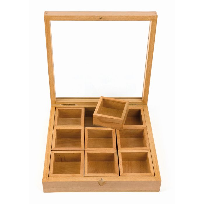 Buchen-Holz, Glas, mit neun herausnehmbaren Innenfächern, 20,5 x 20,5 x 5,5 cm