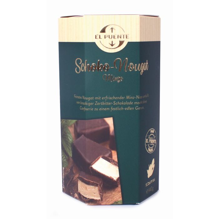 | Zutaten | Nougat (62%) (Glukosesirup, Zucker, Honig 11%, Eiweiß, Oblaten (Kartoffelstärke, Wasser, Olivenöl), Pfefferminzöl, Salz), Zartbitterschokolade (38%) (Kakaomasse, Zucker, Kakaobutter, Emulgator Sojalecithin, Vanillearoma) °100% faire Verarbeitung Kann Spuren von anderen Schalenfrüchten enthalten. Kakao: 55% mindestens in der Zartbitterschokolade |