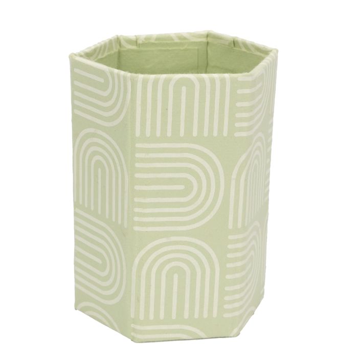 Der Stiftehalter "Bogen" überzeugt durch ein minimalistisches, handbedrucktes Design in Grün und Creme. Perfekt für Stifte, Scheren und mehr – nachhaltig, robust und ein echter Blickfang. Hol Dir ein Stück handgefertigtes Kunsthandwerk und verleihe Deinem Arbeitsplatz eine persönliche Note. Der Stiftehalter ist zusammenfaltbar durch einen beweglichen Boden. Von Kunsthandwerker*innen unseres Handelspartners ASHA in Indien unter fairen Bedingungen gefertigt.