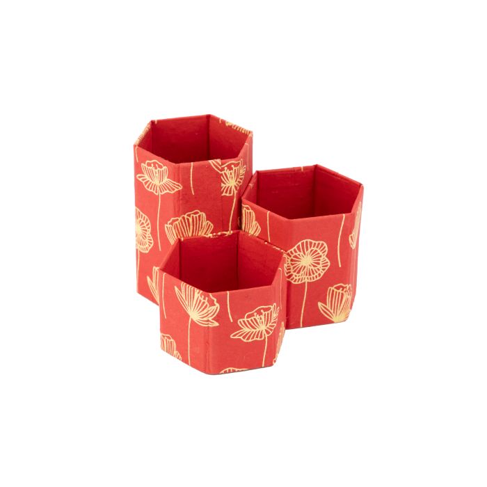 Den aus handgeschöpftem Papier hergestellte Stiftehalter in lebendigem Rot zieren rundherum cremefarbenen, filigran gemalte Blumen. Er verleiht Deinem Arbeitsplatz eine kreative Note und sieht einfach wunderschön aus. Mit seinen faltbaren Eigenschaften (nachhaltig in Versand/Transport) und den praktischen Maßen von 18 x 20 x 7 cm bietet er drei unterschiedlich hohe Fächer für Deine Stifte. Jedes Stück ist ein Unikat, von indischen Kunsthandwerker*innen der Handelspartnerorganisation ASHA liebevoll handgefertigt. Setze ein Zeichen für Fairness und Ästhetik in Deinem Arbeitsumfeld.