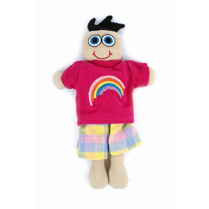 100% handgewebte Baumwolle, Füllung: 100% Polyester, 3-teilig, Anziehpuppe mit bunter Kleidung und Regenbogen, L 23 cm