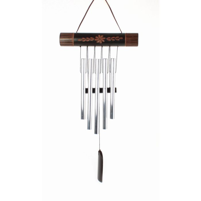 Handgefertigt auf den Philippinen verbindet es hochwertige Materialien mit einzigartigem Design: Die Kombination aus natürlichem Bambus und glänzendem Aluminium spiegelt die Schönheit der Natur wider, während das filigrane Motiv von Blüten und Blättern von Hand eingearbeitet wurde. Dank der Maße von 15 x 43 cm ist das Windspiel flexibel einsetzbar und zieht durch die kunstvolle Fertigung alle Blicke auf sich.
