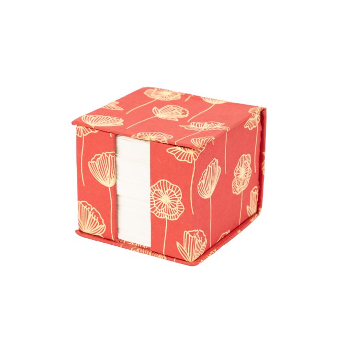 Verschönere Deinen Schreibtisch mit unserer Zettelbox aus handgeschöpftem Papier – in lebendigem Rot mit cremefarbenen Blumen ein echter Blickfang. Die kompakte Größe von 12 x 12 x 10 cm macht sie ideal für jede Ecke – ob am Schreibtisch, Nachtisch oder Telefon. Die unlinierten Blätter bieten viel Platz für kreative Gedanken und Notizen. Jede Box ist ein Unikat, handgefertigt und bedruckt von indischen Kunsthandwerker*innen unserer Partnerorganisation ASHA unter fairen Bedingungen. Hol` Dir diese einzigartige Zettelbox und unterstütze gleichzeitig Kunsthandwerk und soziale Verantwortung.